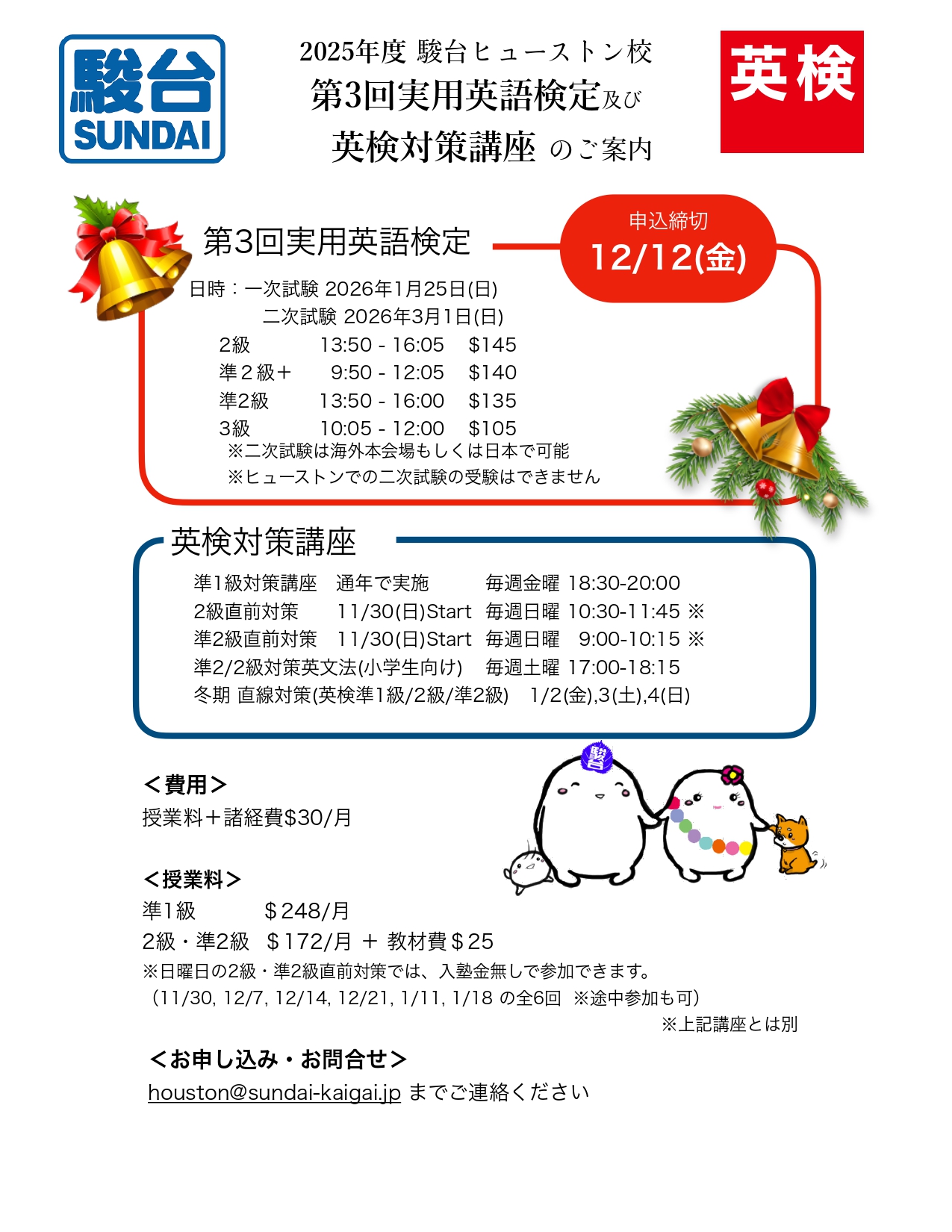 1月25日(日)に駿台ヒューストン校にて 2025年度英検第3回の実用英語検定があります。