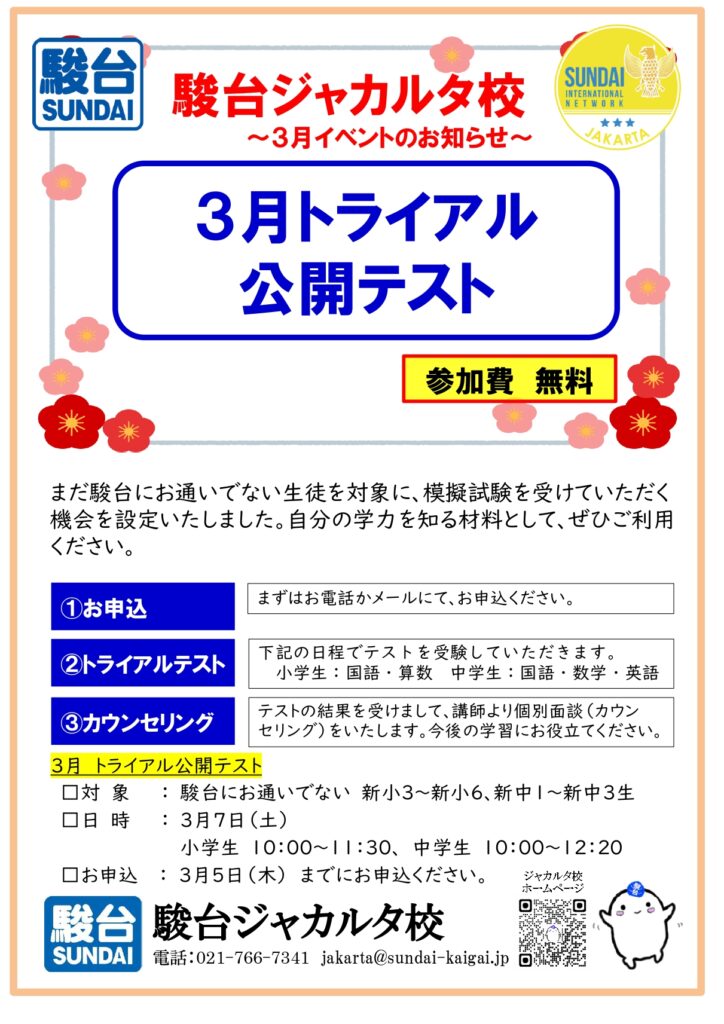 3月トライアル公開テスト(参加費無料)|駿台ジャカルタ校